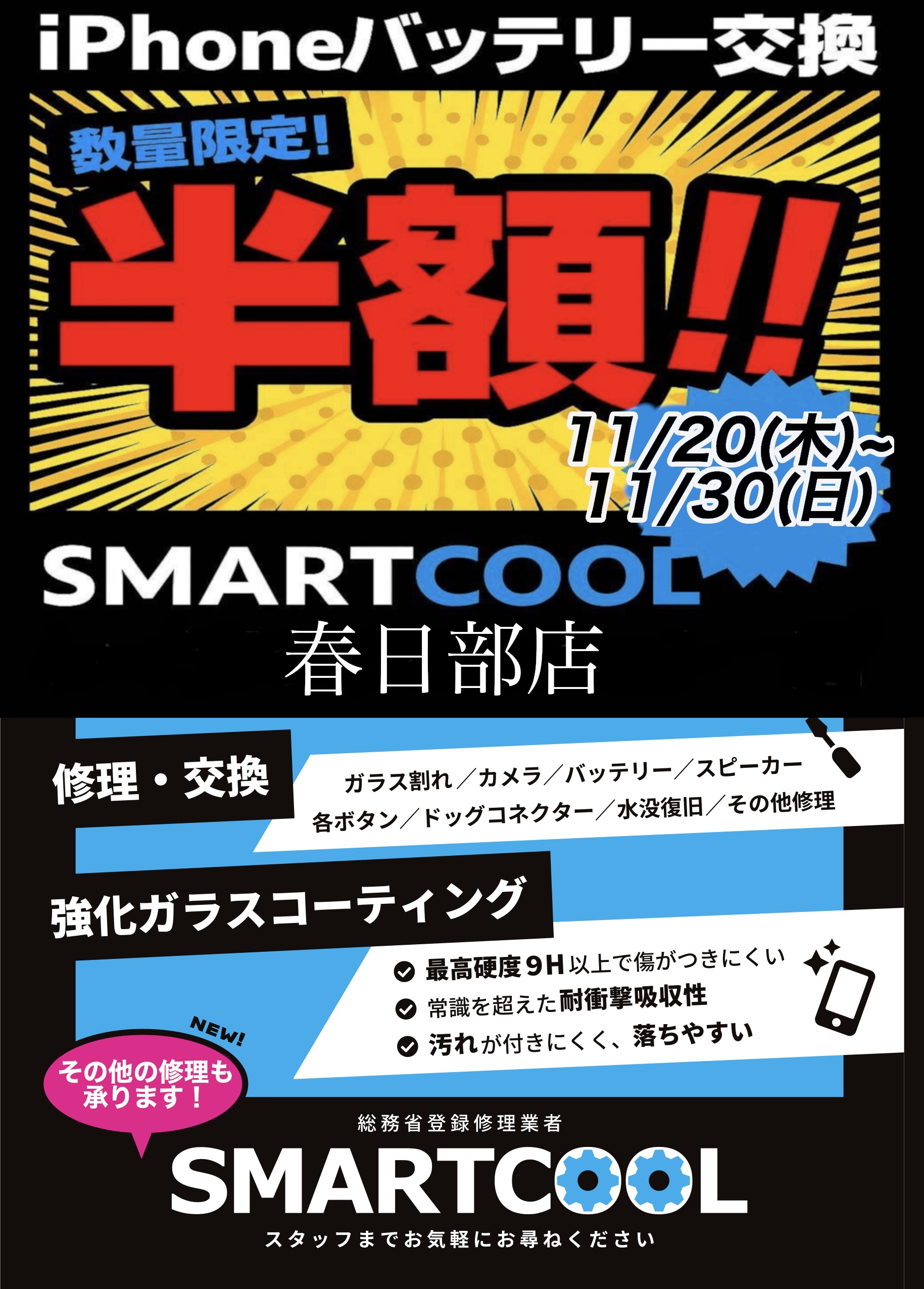 【11月20日~11月30日】iPhoneのバッテリー交換が半額!スマートクール春日部店で即日対応!